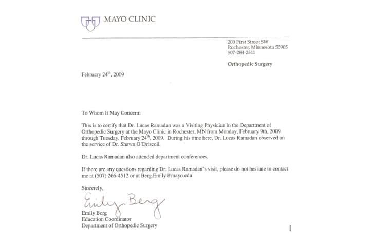 Complementando minha experiência internacional, em 2009 tive a oportunidade de atuar como médico observador no renomado serviço de Ortopedia da Mayo Clinic, em Rochester, Estados